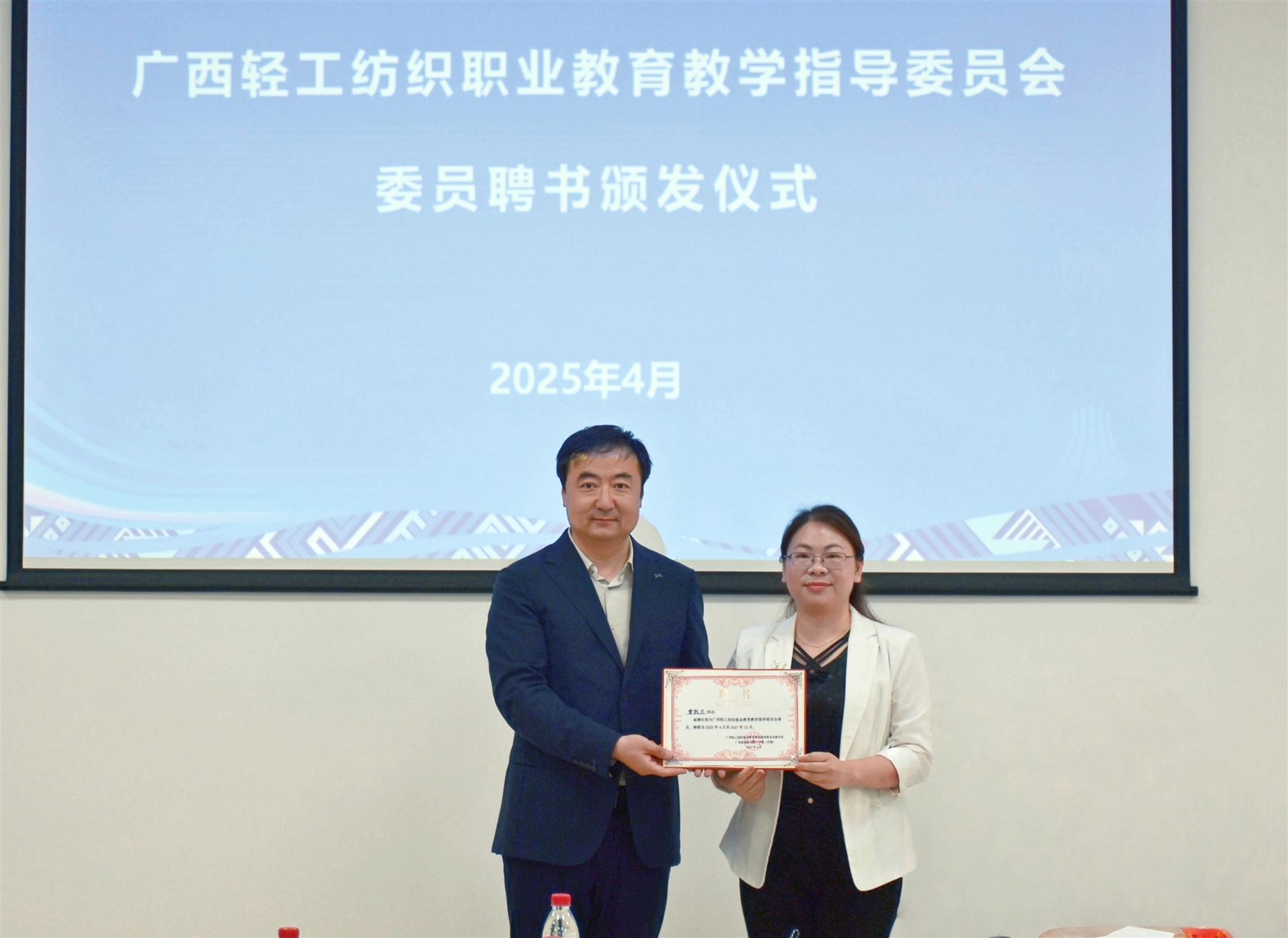 隨后,中國紡織服裝教育學(xué)會會長紀曉峰為百裕集團等委員代表頒發(fā)了廣西輕工紡織職業(yè)教育教學(xué)指導(dǎo)委員會委員聘書。